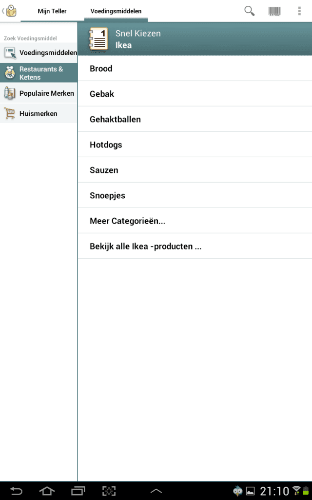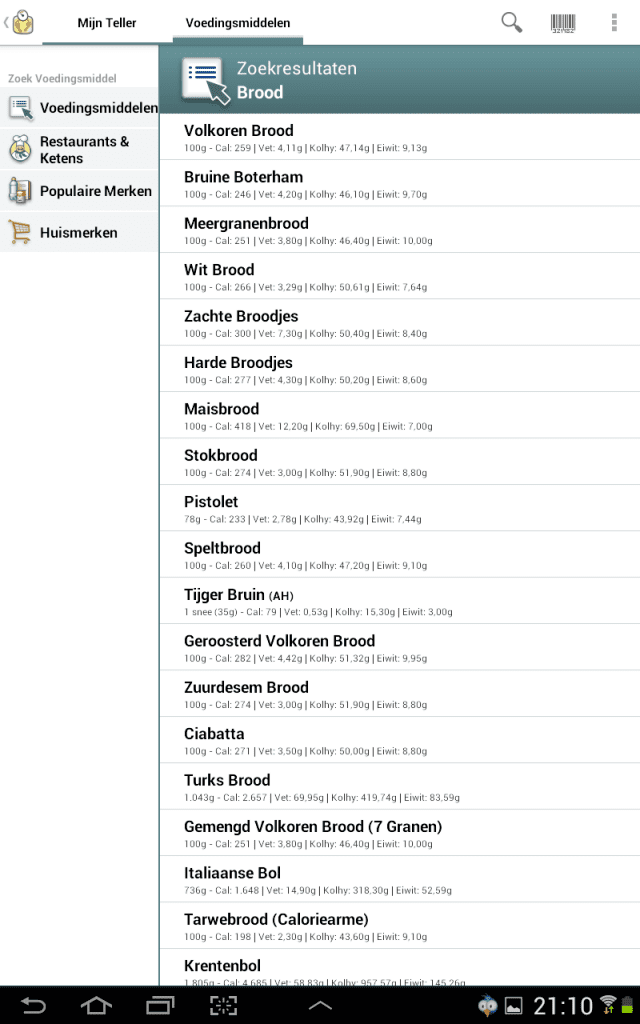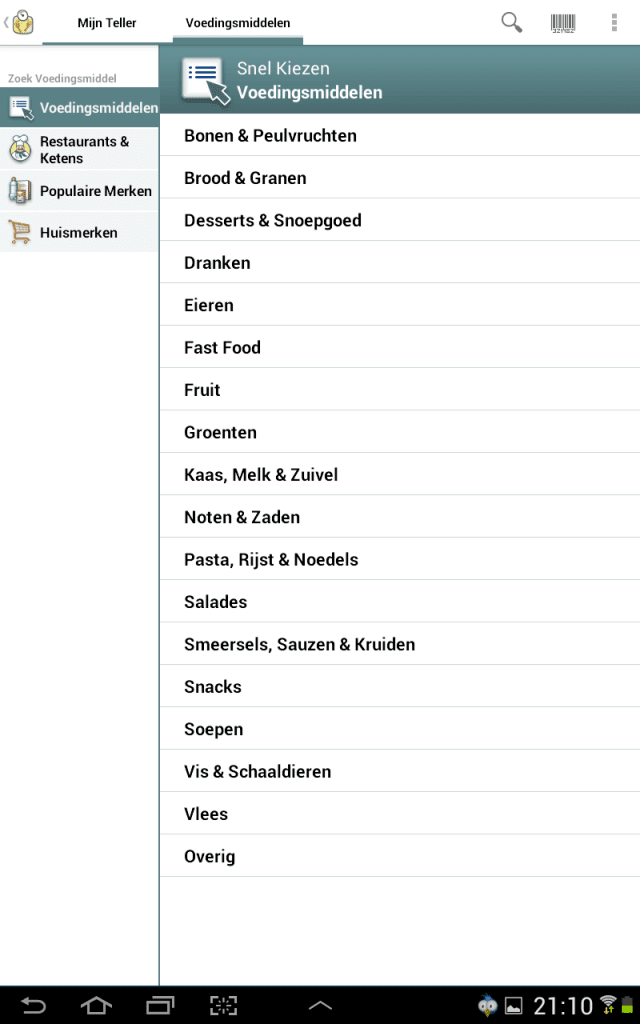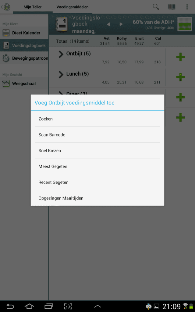 Dat is natuurlijk het belangrijkste. In het eetdagboek kun je toevoegen wat je gegeten hebt. Bijna alle voedingsmiddelen staan erin. Je kunt voedingsmiddelen toevoegen door op het plusje te drukken naast de maaltijdsoort. Op drie manieren kun je voedingsmiddelen toevoegen: de eerste is door zelf te zoeken, de tweede is te kiezen uit een lijst met meest of recent gegeten voedingsmiddelen en de derde is door de streepjescode te scannen van een product. Als de streepjescode niet herkend wordt, kun je het voedingsmiddel toevoegen. Dit vind ik echt superhandig! Bij veel producten kun je het aantal invoeren, de hoeveelheid in gram of mililiter als dat van toepassing is.